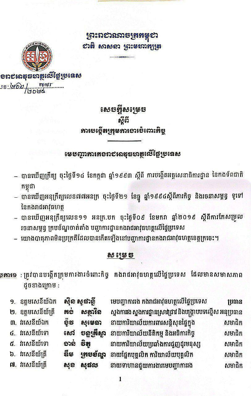 ភ្នំពេញ ៖ នាយឧត្តមសេនីយ៍ សៅ សុខា អគ្គមេបញ្ជាការរង នៃកងយោធពលខេមរភូមិន្ទ មេបញ្ជាការ កងរាជអាវុធហត្ថលើផ្ទៃប្រទេស បានចេញសេចក្តីសម្រេចស្តីពីការបង្កើតក្រុមការងារចំពោះកិច្ច ដើម្បីធ្វើអធិការកិច្ច និងត្រួតពិនិត្យនូវសកម្មភាពមិនប្រក្រតី នៃការប្រតិបត្តិតួនាទី-ភារកិច្ច របស់ មេបញ្ជាការកងរាជអាវុធហត្ថខេត្តក្រចេះ។