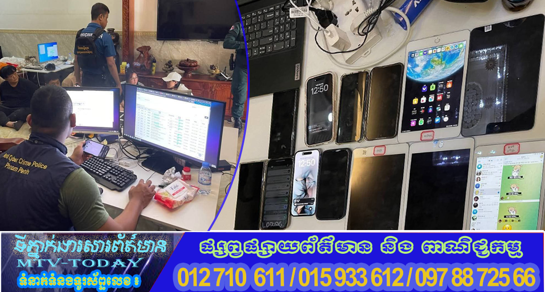 ភ្នំពេញ ៖ ជនសង្ស័យចំនួន ៩នាក់ ត្រូវបានកម្លាំងសមត្ថកិច្ចចម្រុះឃាត់ខ្លួន ក្នុងប្រតិបត្តិការចុះត្រួតពិនិត្យឆែកឆេរ នៅផ្ទះលេខ១៤ ផ្លូវលេខ១៣ ស្ថិតក្នុងបុរីពិភពថ្មីផ្លូវជាតិលេខ៥ សង្កាត់គីឡូម៉ែត្រ៦ ខណ្ឌឫស្សីកែវ រាជធានីភ្នំពេញក្រោមការសង្ស័យថា មានការលបលួចប្រព្រឹត្តបទល្មើសឆបោកតាមប្រព័ន្ធបច្ចេកវិទ្យា (Online Scam)។