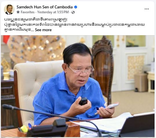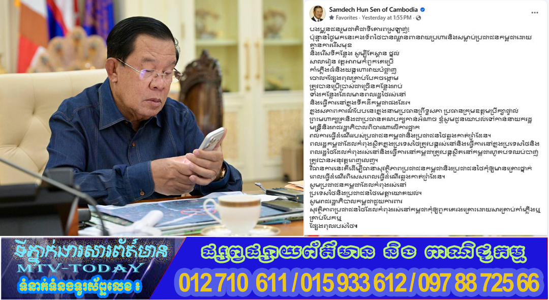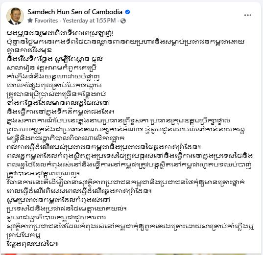 សម្តេចអគ្គមហាសេនាបតីតេជោ ហ៊ុន សែន ៖ <<ម្សឹលមុិញខ្ញុំបានបង្ហោះសារមួយជូនយោបល់ចំពោះរាជរដ្ឋាភិបាលចំពោះ ករណីប្រជាជនកម្ពុជានិងប្រជាជនថៃធ្វើដំណើរឆ្លងកាត់តាមព្រំដែនគោកគួរត្រូវបានផ្អាកដើម្បីធានាសុវត្តិភាពទាំងប្រជាជនកម្ពុជានិងទាំងប្រជាជនថៃ។