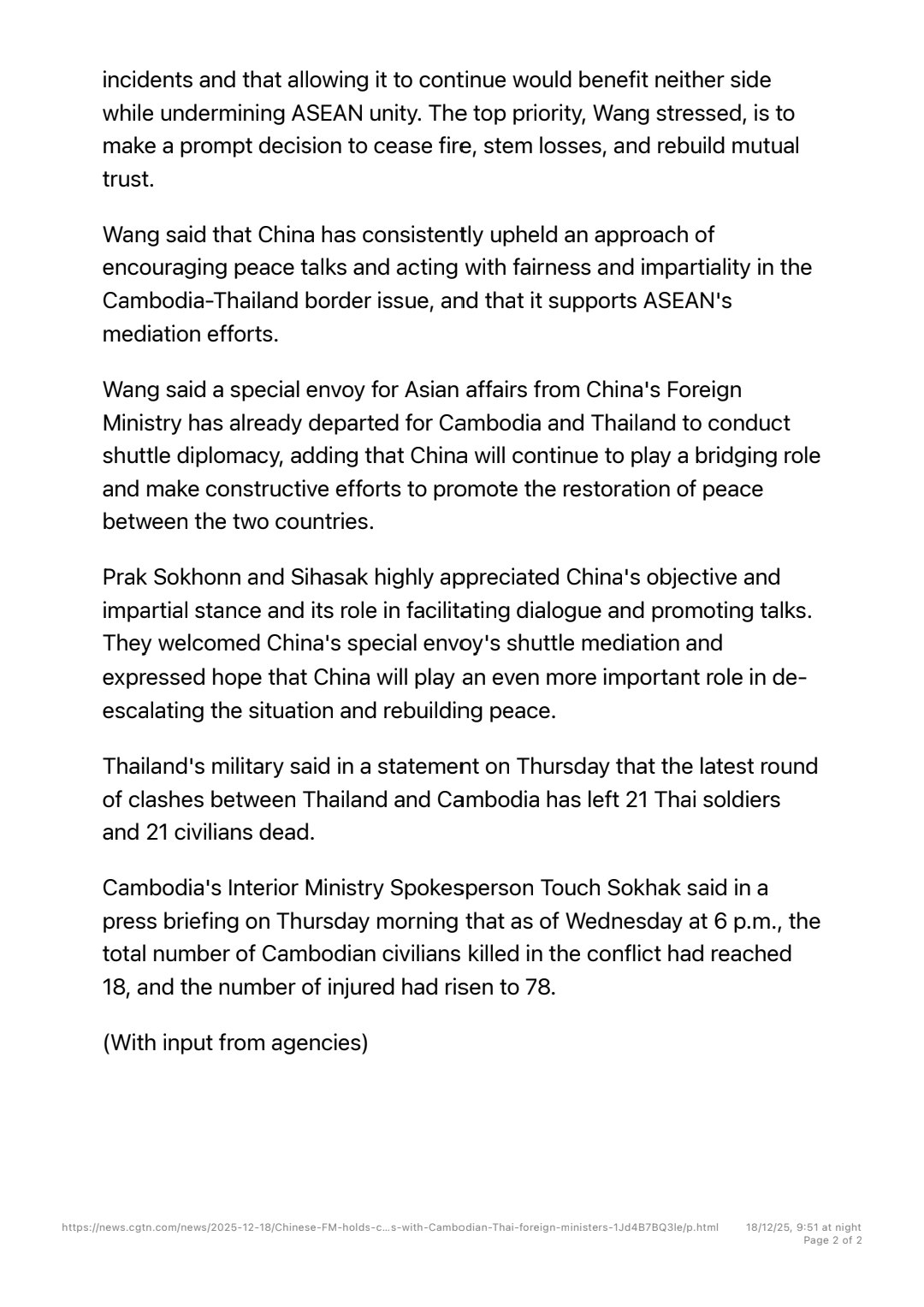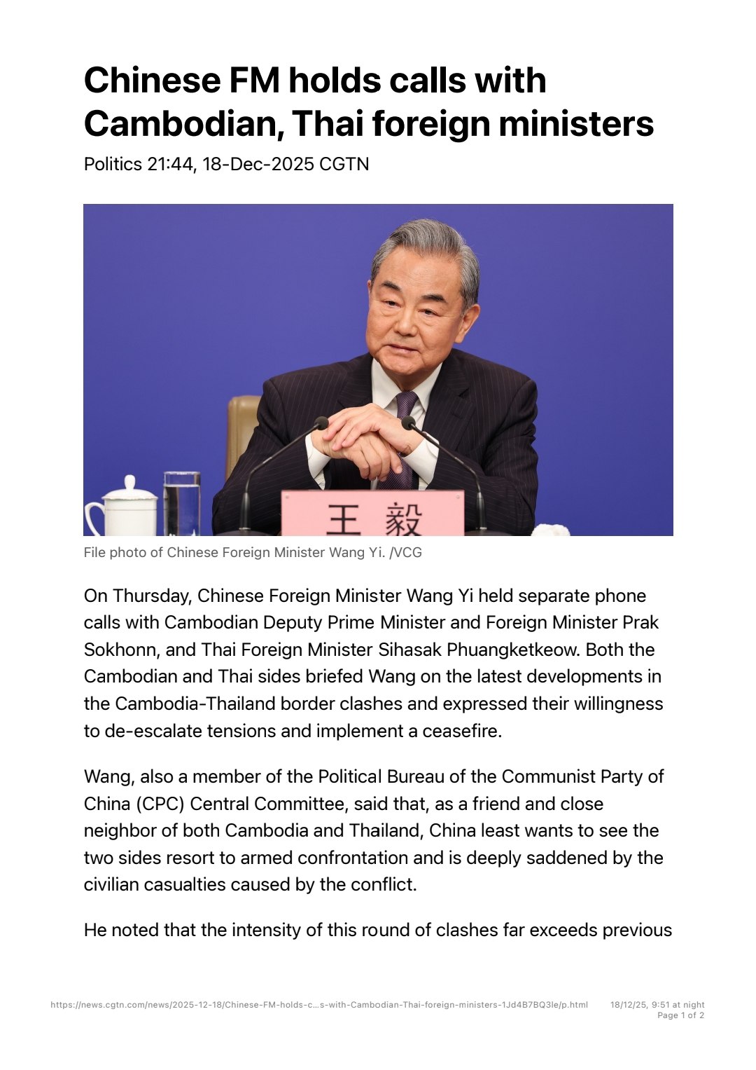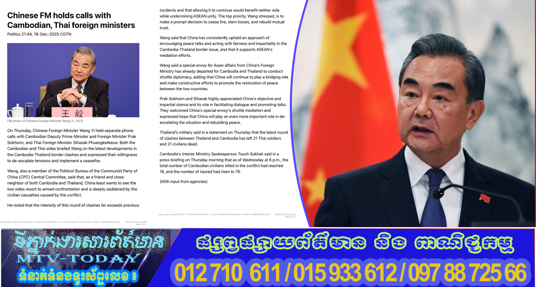 ថ្ងៃនេះ រដ្ឋមន្ត្រីការបរទេសចិន បានជួបតាមទូរស័ព្ទដាច់ដោយឡែកពីគ្នា ជាមួយរដ្ឋមន្ត្រីការបរទេសកម្ពុជា និង រដ្ឋមន្ត្រី​ការបរទេសថៃ ដើម្បីពិភាក្សាអំពីសង្គ្រាមរវាងប្រទេសទាំងពីរ។