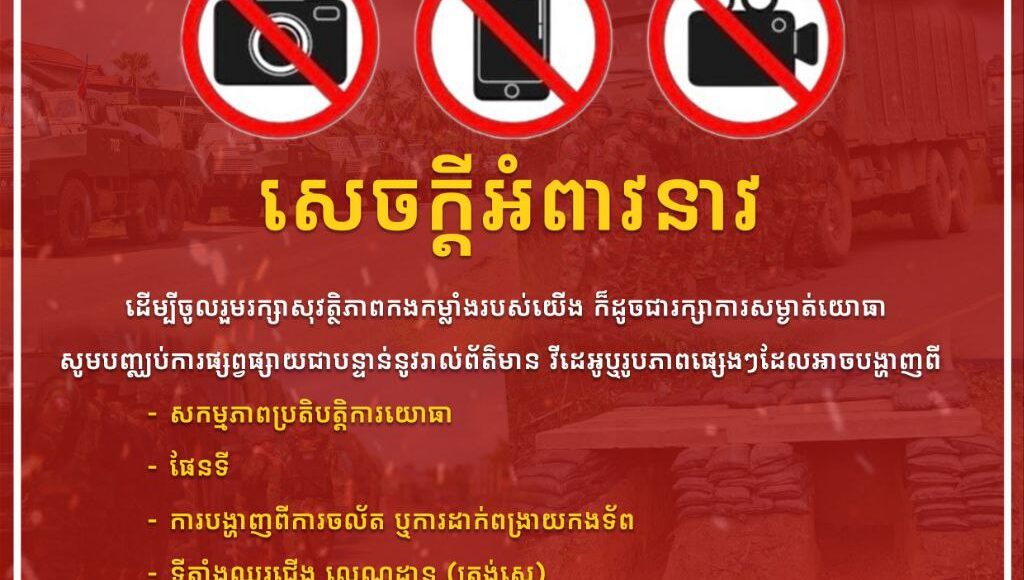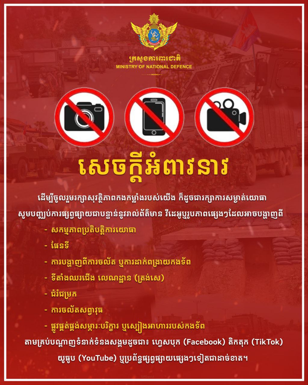 ដើម្បីចូលរួមរក្សាសុវត្ថិភាពកងកម្លាំងរបស់យើង ក៏ដូចជារក្សាការសម្ងាត់យោធា សូមបញ្ឈប់ការផ្សព្វផ្សាយជាបន្ទាន់នូវរាល់ ព័ត៌មាន, វីដេអូ ឬរូបភាពដែលអាចបង្ហាញពីសកម្មភាពប្រតិបត្តិការយោធា, ផែនទី, ការបង្ហាញពីការចល័ត ឬការដាក់ពង្រាយកងទ័ព, ទីតាំងឈរជើង, លេណដ្ឋាន (ត្រង់សេ), ជំរុំជម្រក, ការចល័តសព្វាវុធ, ផ្លូវផ្គត់ផ្គង់សម្ភារបរិក្ខារ ឬស្បៀងអាហារ របស់កងទ័ព តាមគ្រប់បណ្តាញទំនាក់ទំនងសង្គម ដូចជា Facebook, TikToK, Youtube ឬប្រព័ន្ធផ្សព្វផ្សាយផ្សេងៗទៀតជាដាច់ខាត។