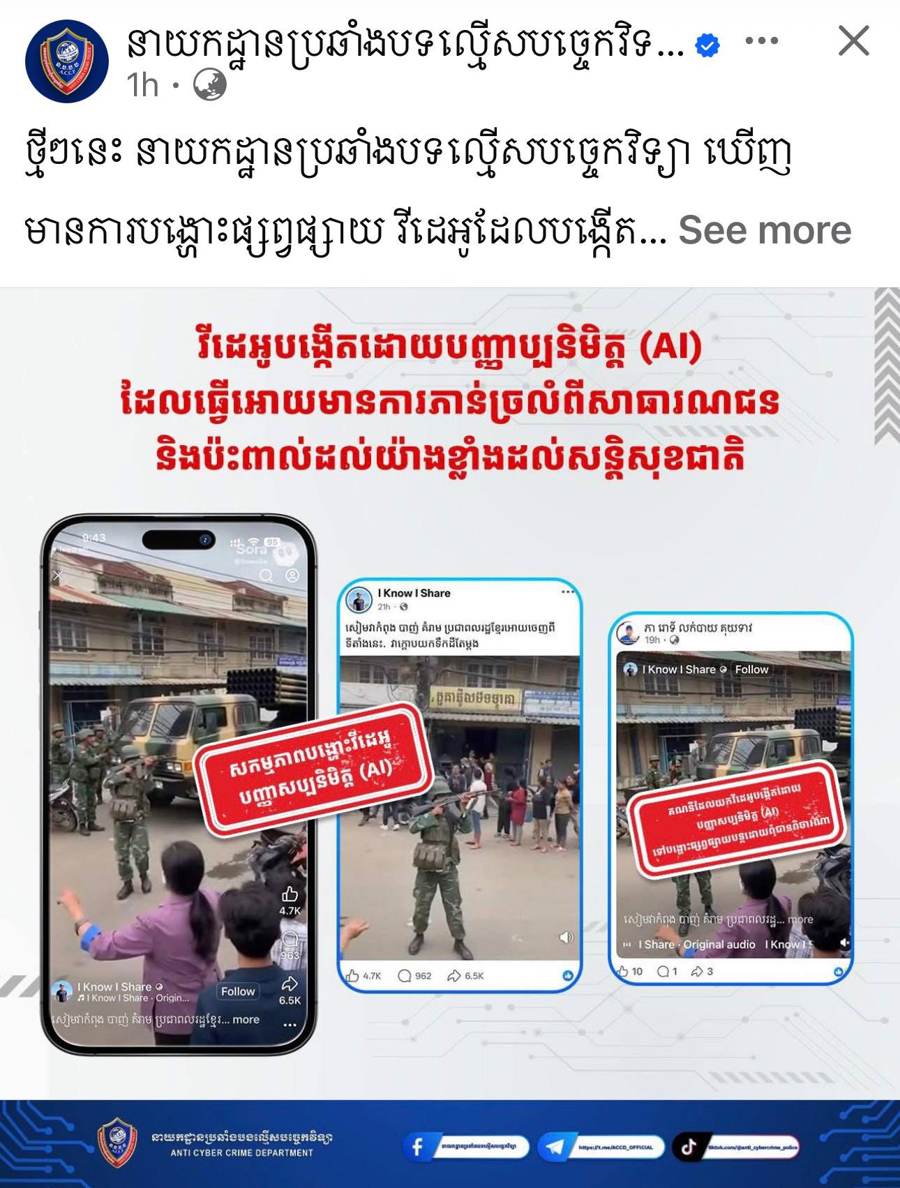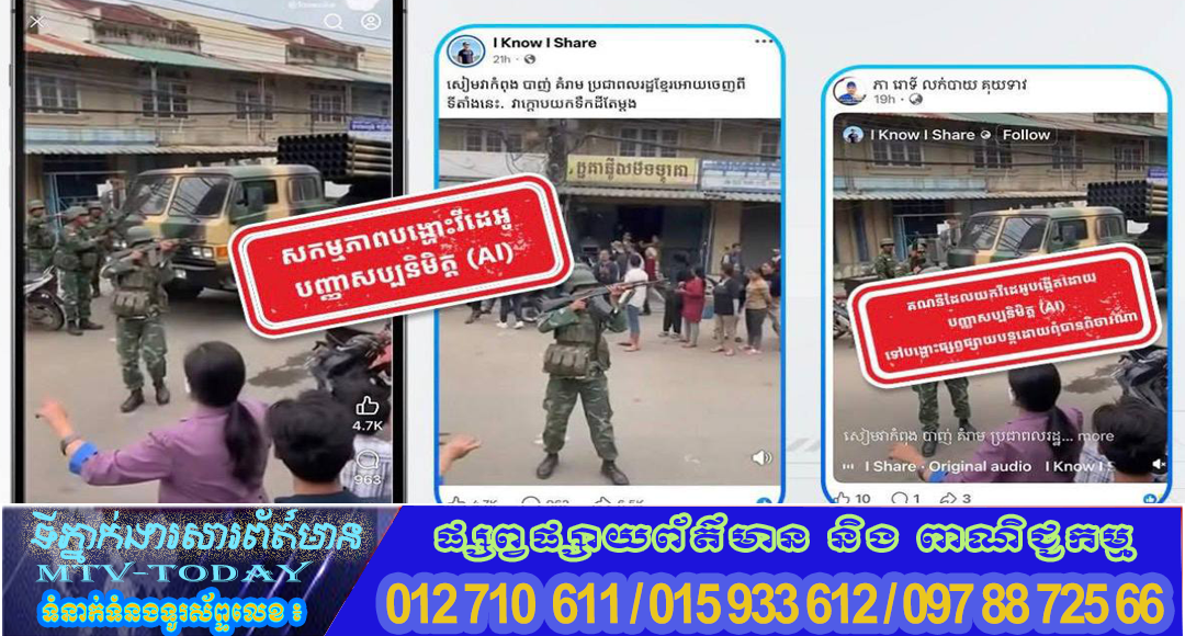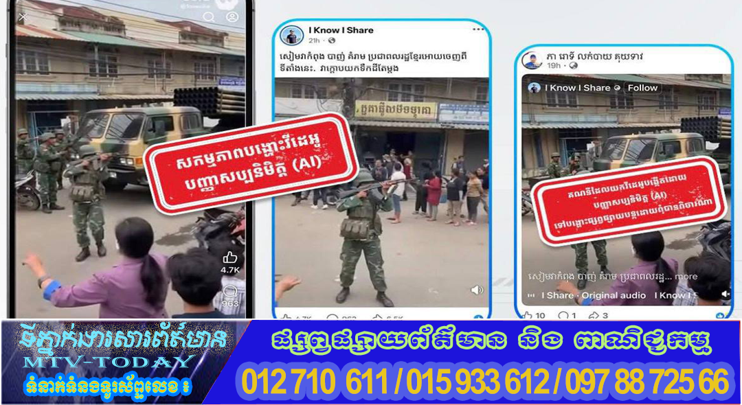 ភ្នំពេញ ៖ ថ្មីៗនេះ នាយកដ្ឋានប្រឆាំងបទល្មើសបច្ចេកវិទ្យា ឃើញមានការបង្ហោះផ្សព្វផ្សាយ វីដេអូដែលបង្កើតដោយបញ្ញាសប្បនិមិត្ត (AI) ដែលមានចេតនាបំពុលសង្គម ទាក់ទាញចំណាប់អារម្មណ៍ពីអ្នកប្រើប្រាស់តាមបណ្តាញទំនាក់ទំនងសង្គម ដើម្បីទទួលបានផលប្រយោជន៍ពីការបង្ហោះផ្សព្វផ្សាយព័ត៌មានបំពុលសង្គមនេះ ដែលធ្វើអោយមានការភាន់ច្រលំពីសារធារណជន និងប៉ះពាល់ដល់យ៉ាងខ្លាំងដល់សន្តិសុខជាតិ។