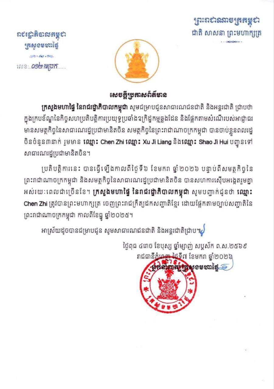 ក្រសួងមហាផ្ទៃប្រកាសអំពីការចាប់ខ្លួន លោក Chen Zhi និងបញ្ជូនពលរដ្ឋចិន ២នាក់ទៀត ទៅសាធារណរដ្ឋប្រជាមានិតចិនវិញ