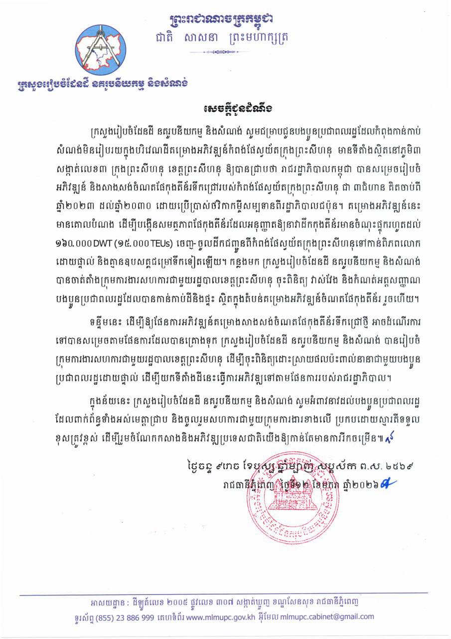ក្រសួងរៀបចំដែនដី នគរូបនីយកម្ម និងសំណង់ បានចេញសេចក្តីអំពាវនាវដល់បងប្អូនប្រជាពលរដ្ឋ ដែលកំពុងកាន់កាប់សំណង់មិនរៀបរយក្នុងបរិវេណដីគម្រោងអភិវឌ្ឍន៍កំពង់ផែស្វយ័តក្រុងព្រះសីហនុ មានទីតាំងស្ថិតនៅភូមិ៣