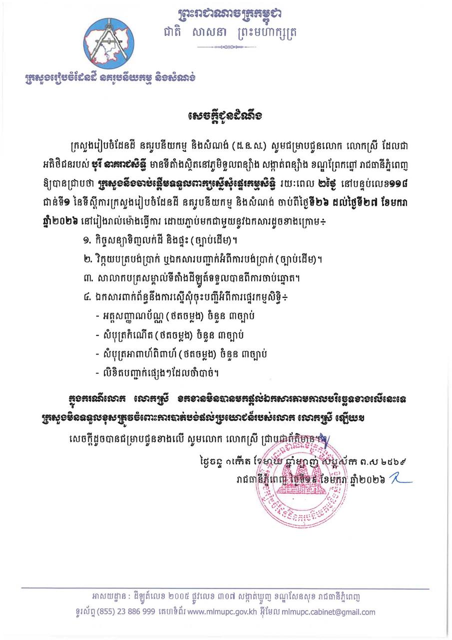 កាលបរិច្ឆេទ៖ ចាប់ពីថ្ងៃទី២៦+២៧ ខែមករា ឆ្នាំ២០២៦ នៅរៀងរាល់ម៉ោងធ្វើការ