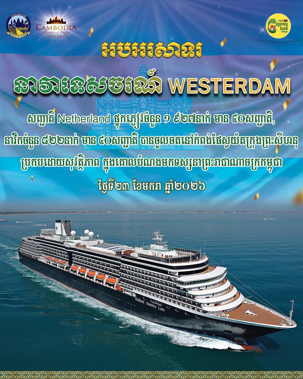 កម្ពុជាសូមស្វាគមន៍ ការវិលត្រឡប់មកជាថ្មី នាវាទេសចរណ៍ឈ្មោះ WESTERDAM សញ្ជាតិ Netherland បានចូលចតនៅកំពង់ផែស្វយ័តក្រុងព្រះសីហនុដោយសុវត្ថិភាព