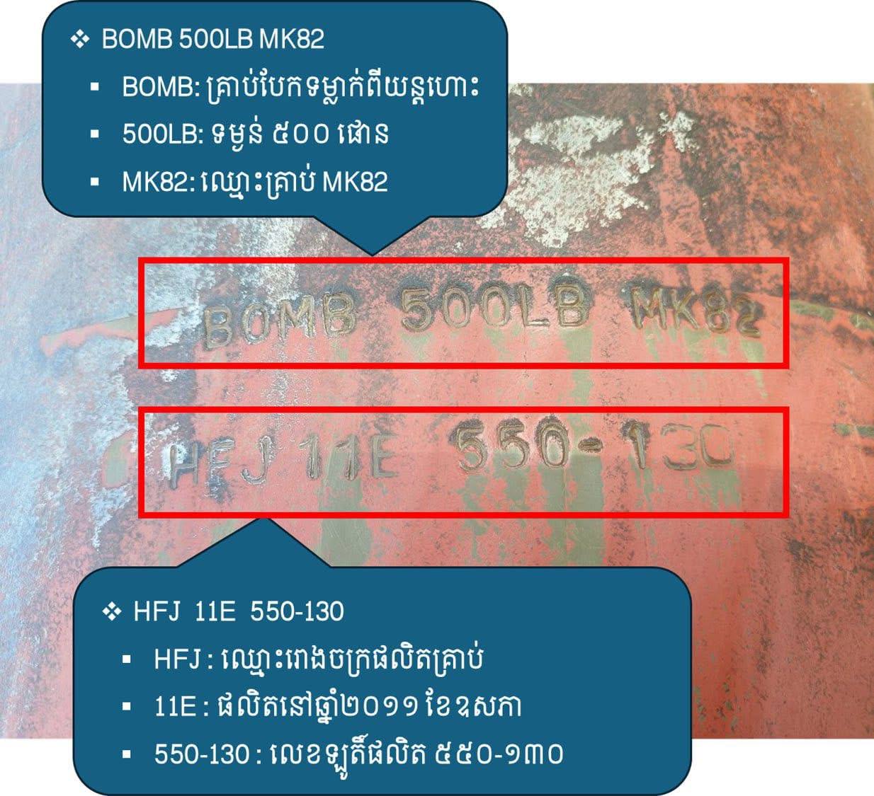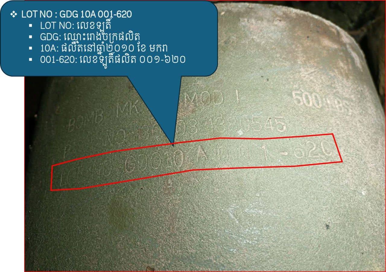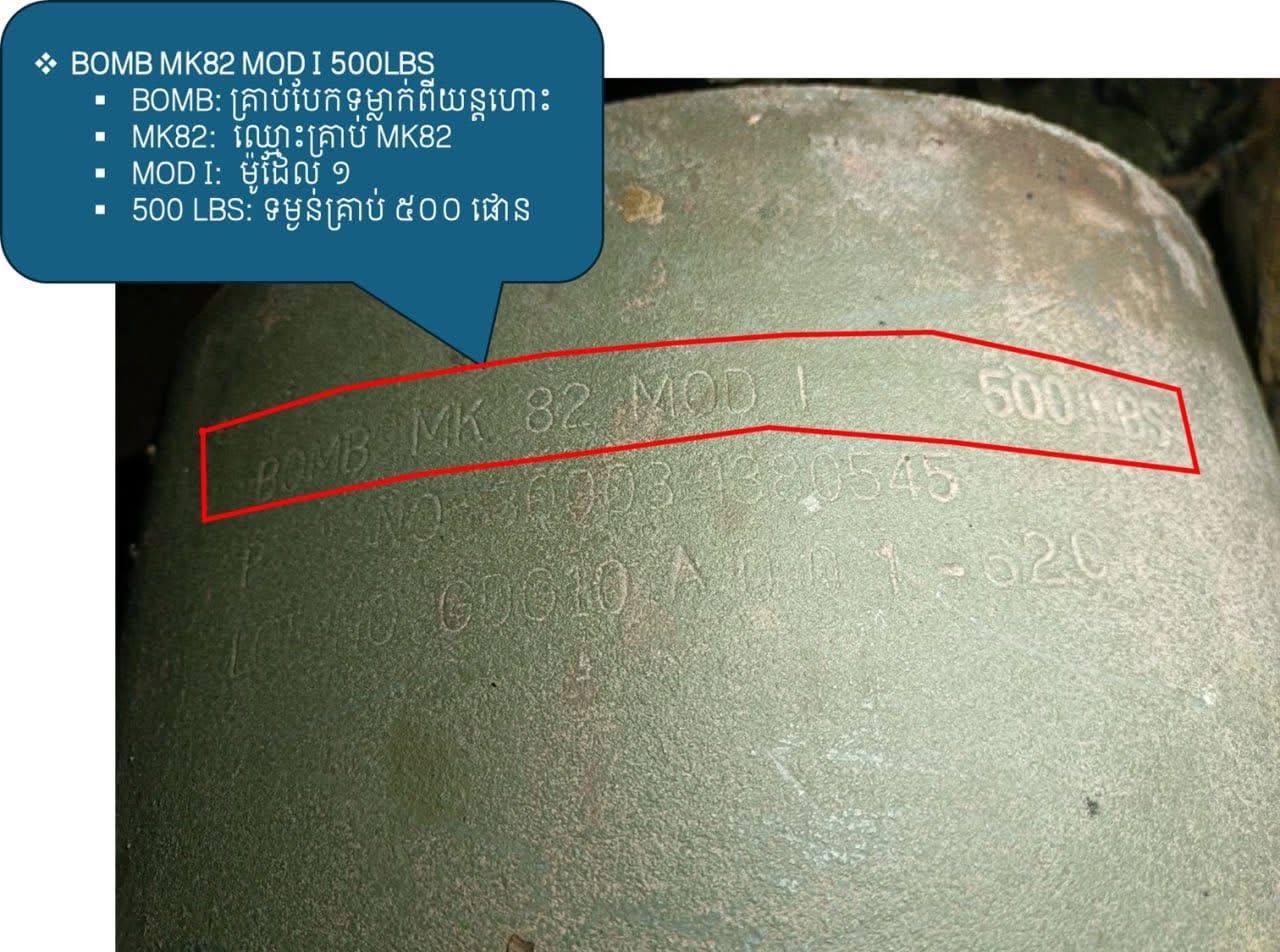 កងកម្លាំងជំនាញអង្គភាព CMAC បានដោះបន្សាបគ្រាប់បែកទម្លាក់ពីយន្តហោះប្រភេទ MK-82 ទម្ងន់ជាង ២៣០គីឡូក្រាម ចំនួន២គ្រាប់ ដែលគ្រាប់បែកទាំងនេះផលិតនៅខែមករា ឆ្នាំ២០១០ និងខែឧសភា ឆ្នាំ២០១១ ហេីយគ្រាប់បែកទាំងនេះបានទម្លាក់នៅថ្ងៃទី១១ ខែធ្នូ ឆ្នាំ២០២៥ ក្នុងសង្គ្រាមសៀមឈ្លានពាន ក្នុងភូមិសាស្ត្រសមរភូមិព្រំដែនកម្ពុជា-សៀម។ ប្រភព៖ ឯកឧត្ដម ហេង រតនា អគ្គនាយកស៊ីម៉ាក់