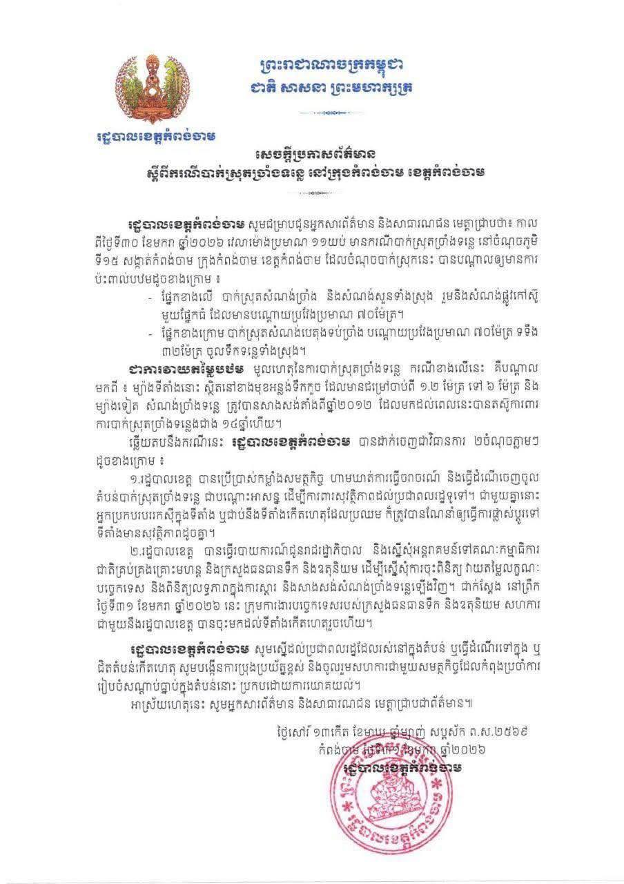 ព័ត៌មានជាតិសន្តិសុខសង្គម មូលហេតុនៃការបាក់ស្រុតច្រាំងទន្លេនៅក្រុងកំពង់ចាម គឺបណ្តាលមកពីទីតាំងនោះ ចឹងសោះ By MTV Today On Jan 31, 2026 ខេត្តកំពង់ចាម ៖ ជាការវាយតម្លៃបឋម មូលហេតុនៃការបាក់ស្រុតច្រាំងទន្លេនៅក្រុងកំពង់ចាម គឺបណ្តាល មកពីទីតាំងនោះ ស្ថិតនៅខាងមុខអន្លង់ទឹកកួច ដែលមានជម្រៅចាប់ពី ១.២ម៉ែត្រ ទៅ ៦ម៉ែត្រ និងម្យ៉ាងទៀត សំណង់ច្រាំងទន្លេ ត្រូវបានសាងសង់តាំងពីឆ្នាំ២០១២ ដែលមកដល់ពេលនេះ បានតស៊ូការពារ ការបាក់ស្រុតច្រាំងទន្លេងជាង ១៤ឆ្នាំហើយ។ ឆ្លើយតបនឹងករណីនេះ រដ្ឋបាលខេត្តកំពង់ចាម បានដាក់ចេញជាវិធានការ ២ចំណុចភ្លាមៗ៖ ១.រដ្ឋបាលខេត្ត បានប្រើប្រាស់កម្លាំងសមត្ថកិច្ច ហាមឃាត់ការធ្វើចរាចរណ៍ និងធ្វើដំណើចេញចូល តំបន់បាក់ស្រុតច្រាំងទន្លេ ជាបណ្តោះអាសន្ន ដើម្បីការពារសុវត្ថិភាពដល់ប្រជាពលរដ្ឋទូទៅ។ ២. រដ្ឋបាលខេត្ត បានធ្វើរបាយការណ៍ជូនរាជរដ្ឋាភិបាល និងស្នើសុំអន្តរាគមន៍ទៅគណៈកម្មាធិការជាតិគ្រប់គ្រងគ្រោះមហន្ត និងក្រសួងធនធានទឹក ដើម្បីស្នើសុំការចុះពិនិត្យ វាយតម្លៃលក្ខណៈបច្ចេកទេស និងពិនិត្យលទ្ធភាពក្នុងការស្តារ និងសាងសង់សំណង់ច្រាំងទន្លេឡើងវិញ។ ជាក់ស្តែង នៅព្រឹកថ្ងៃទី៣១ ខែមករានេះ ក្រុមការងារបច្ចេកទេសក្រសួងធនធានទឹក និងរដ្ឋបាលខេត្ត បានចុះមកដល់ទីតាំងកើតហេតុរួចហើយ៕ អរគុណសន្តិភាព Share FacebookTelegramEmailLinkedinPrint