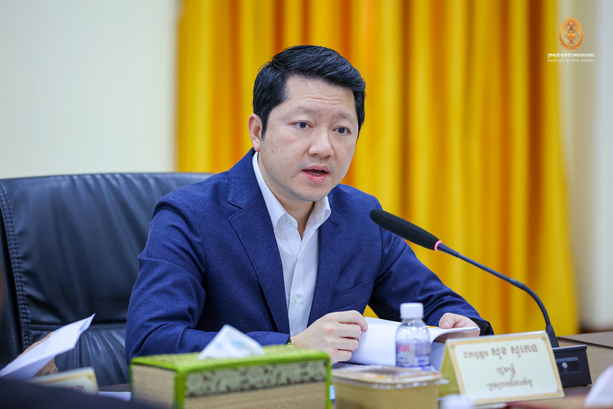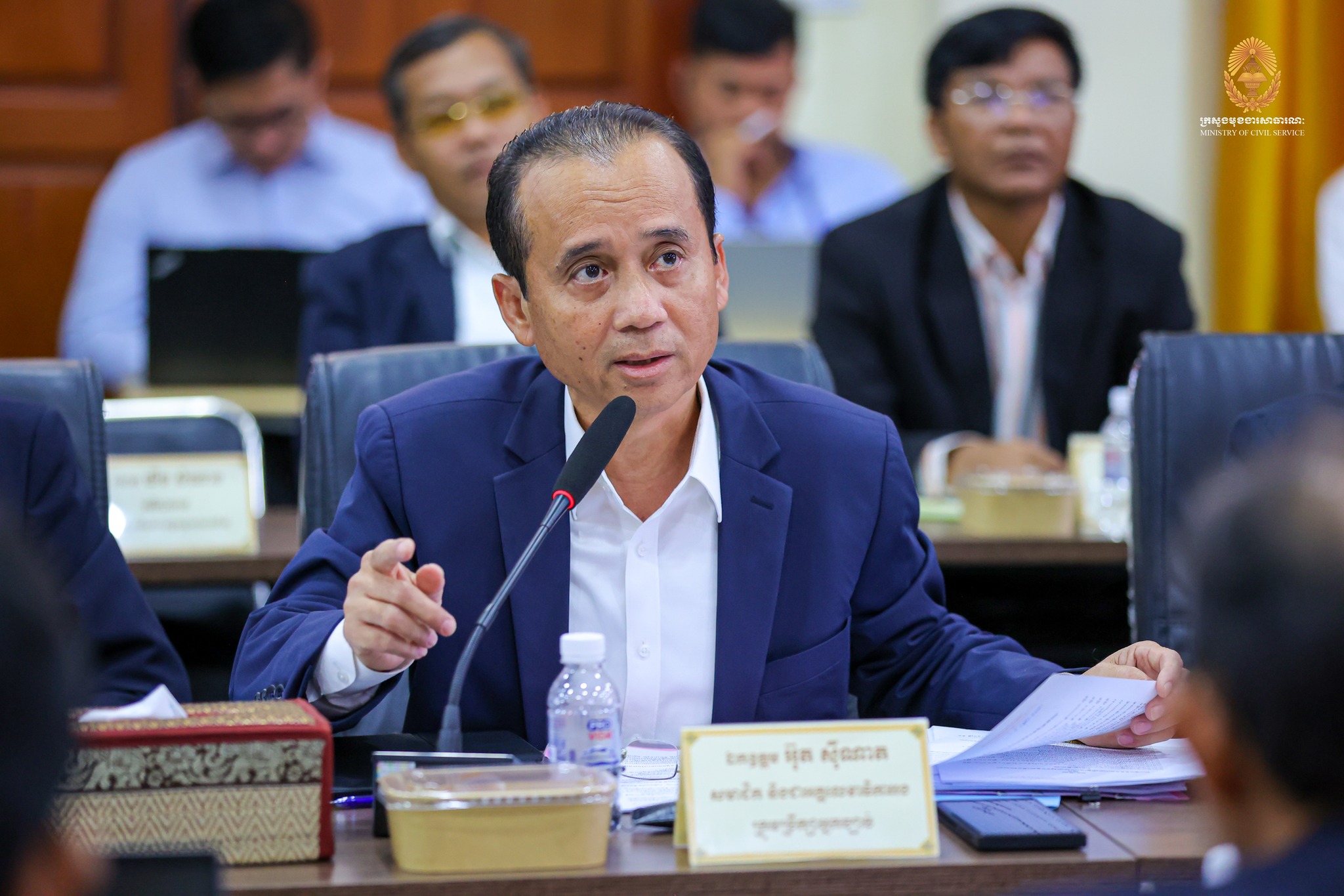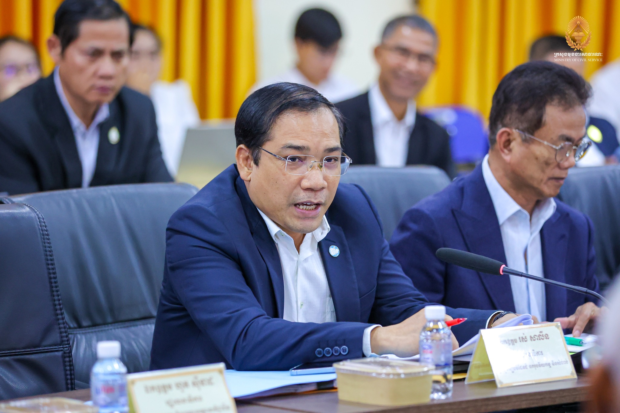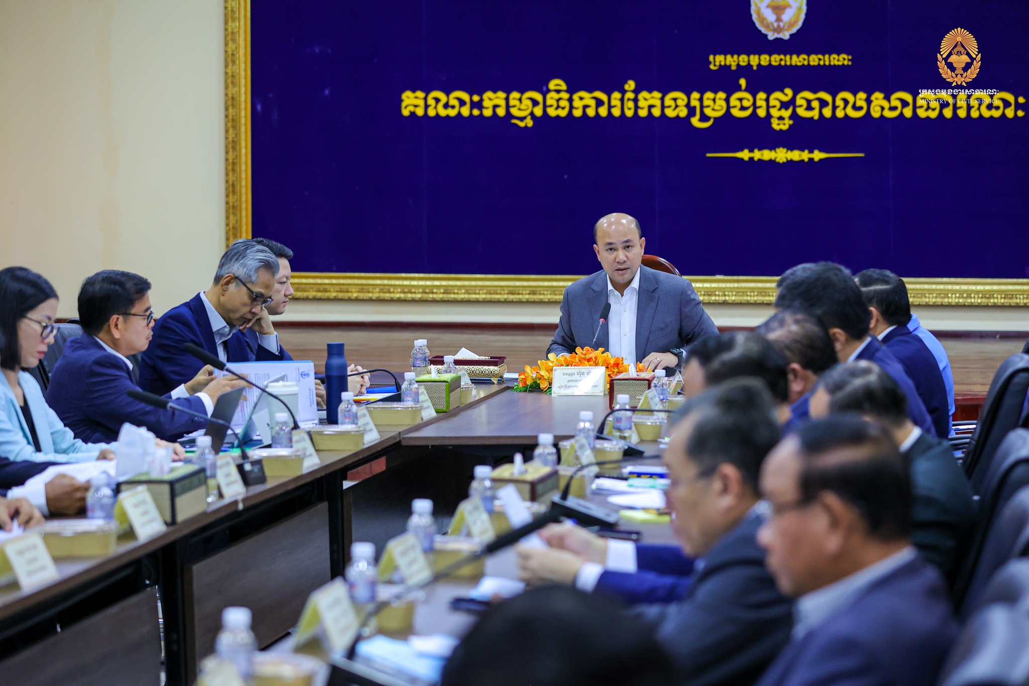 “កិច្ចពិភាក្សារបស់យើងនារសៀលនេះ ស្ថិតក្នុងការអនុវត្តវិធានការគន្លឹះទី២ ក្នុងការកែទម្រង់រដ្ឋបាលសាធារណៈ។ ទៀតសោត ការរៀបចំនិងការប្រព្រឹត្តទៅរបស់ក្រសួង ស្ថាប័ន គឺស្របទៅតាមគោលការណ៍ណែនាំរបស់ សម្តេចមហាបវរធិបតី «ពង្រឹងជាជាងពង្រីក» និង «រៀបចំផ្ទះរបស់ខ្លួនឱ្យរៀបរយ» ព្រមទាំងមានភាពប្រទាក់ក្រឡាគ្នាក្នុងជវភាពនៃប្រព័ន្ធតួអង្គតែមួយ។” ឯកឧត្តមបានបន្ថែម។