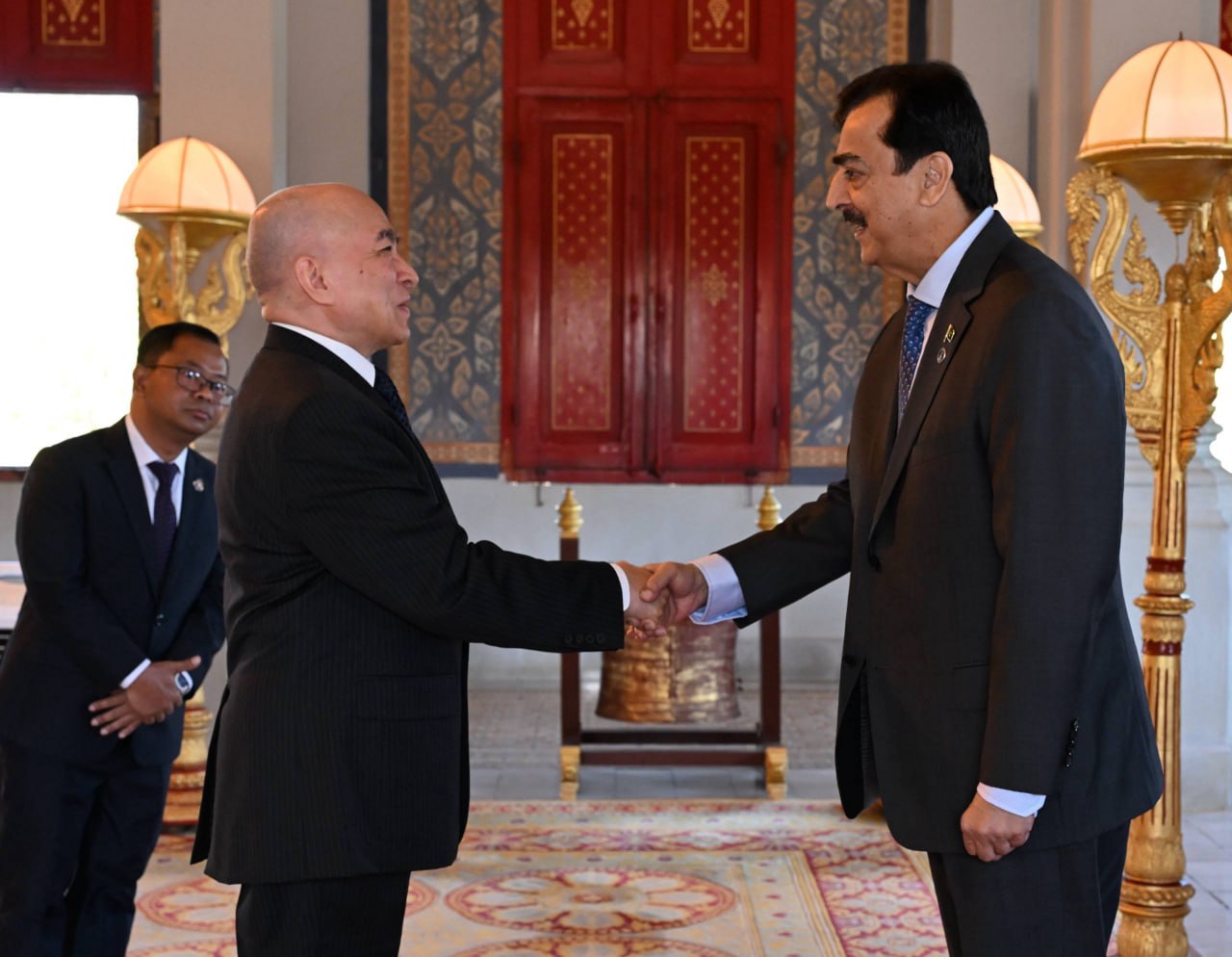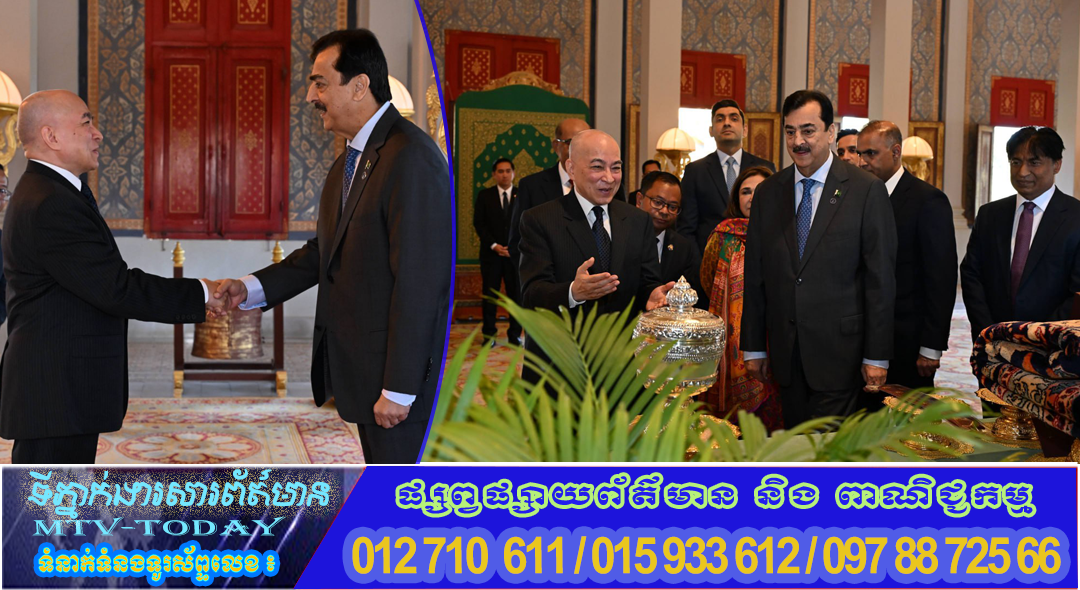 ភ្នំពេញ ៖ ព្ររះករុណា ព្រះបាទសម្តេចព្រះបរមនាថ នរោត្តម សីហមុនី ព្រះមហាក្សត្រនៃព្រះរាជាណាចក្រកម្ពុជា ជាទីគោរពសក្ការៈដ៏ខ្ពង់ខ្ពស់បំផុត ព្រះអង្គសព្វព្រះរាជហឬទ័យ ព្រះបរមរាជានុញ្ញាត ជូនឯកឧត្តម ស៊ីយ៉េដ យូសាហ្វ រ៉ាហ្សា ជីឡានី (H.E. Syed Yousaf Raza Gilani) ប្រធានព្រឹទ្ធសភា នៃសាធារណរដ្ឋឥស្លាមប៉ាគីស្ថាន និងជាប្រធានស្ថាបនិក នៃសន្និសីទប្រធានសភានៃអន្តរសភា (ISC) ចូលក្រាបបង្គំគាល់ នៅព្រឹកថ្ងៃទី០៣ ខែកុម្ភៈ ឆ្នាំ២០២៦ នៅព្រះបរមរាជវាំង ក្នុងឱកាសដែលឯកឧត្តមដឹកនាំគណៈប្រតិភូព្រឹទ្ធសភាប៉ាគីស្ថាន អញ្ជើញមកបំពេញទស្សនកិច្ចផ្លូវការ នៅព្រះរាជាណាចក្រកម្ពុជា ពីថ្ងៃទី២-៥ ខែកុម្ភៈ ឆ្នាំ២០២៦៕ រូបថត៖ ក្រសួងព្រះបរមរាជវាំង
