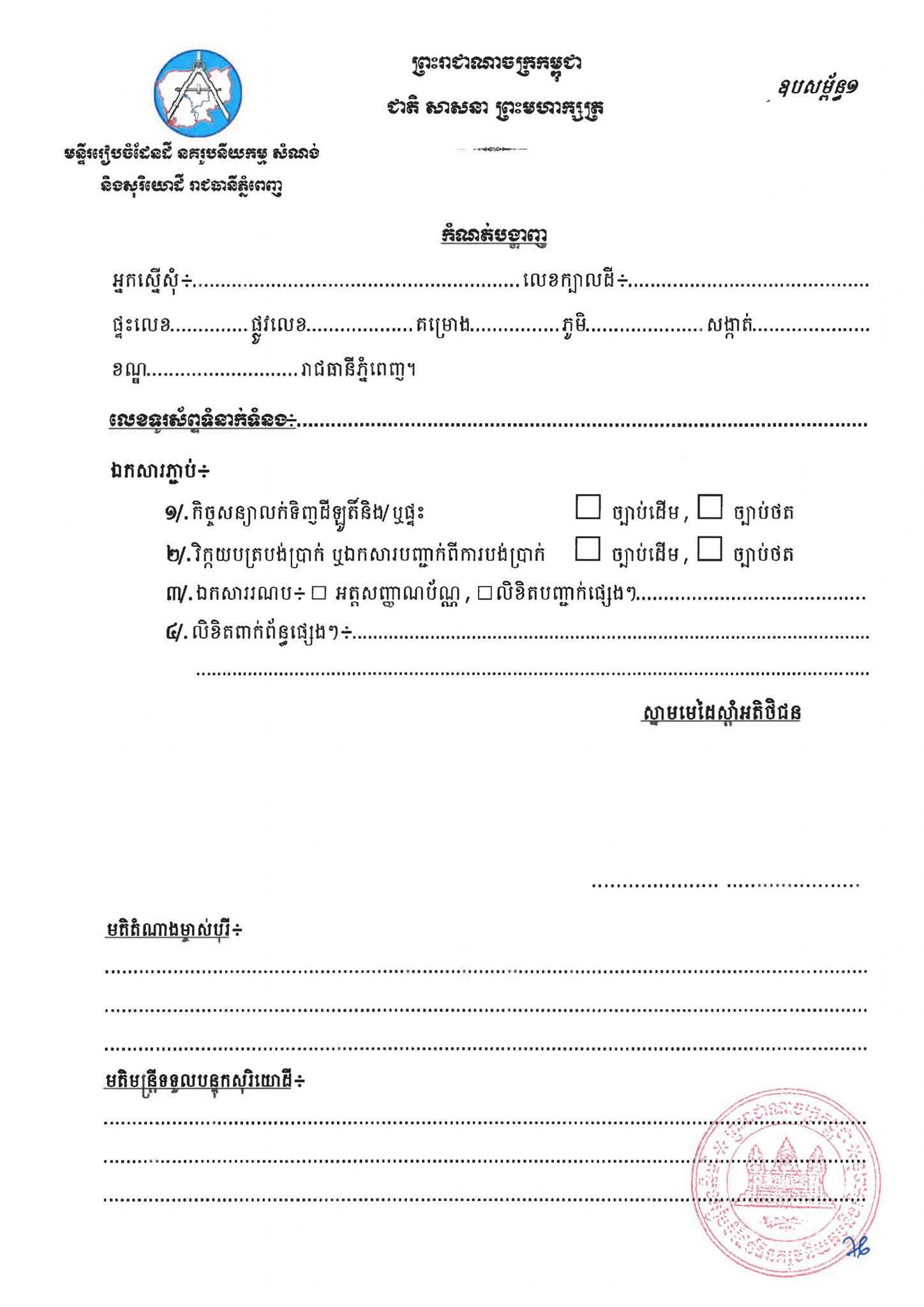 ភ្នំពេញ ៖ ក្រសួងរៀបចំដែនដីនគរូបនីយកម្មនិងសំណង់អញ្ជើញបងប្អូនជាអតិថិជនរបស់គម្រោងអភិវឌ្ឍន៍បុរី ខេភី ម៉ន ដានី ក្នុងភូមិសាស្ត្ររាជធានីភ្នំពេញ (ដូចមានបញ្ជីឈ្មោះក្នុងតារាងឧបសម្ព័ន្ធ) មកបន្តនីតិវិធីចុះបញ្ជីផ្ទេរកម្មសិទ្ធិ ចាប់ពីថ្ងៃទី៩-១៣ កុម្ភៈ ២០២៦ នៅរៀងរាល់ម៉ោងធ្វើការ ដោយភ្ជាប់មកជាមួយនូវឯកសារពាក់ព័ន្ធដូចមានក្នុងសេចក្តីប្រកាសព័ត៌មាន។