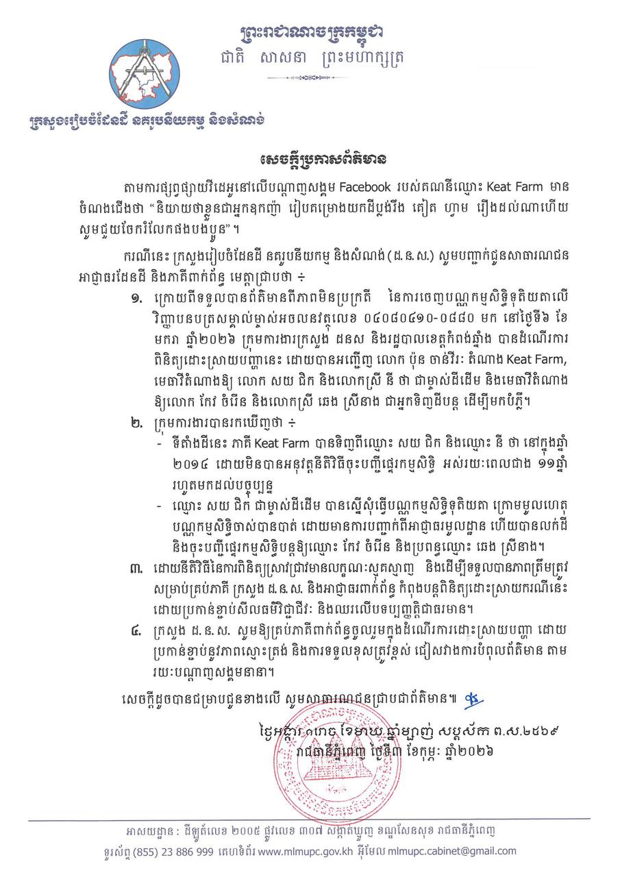 ភ្នំពេញ ៖ ក្រសួងរៀបចំដែនដី នគរូបនីយកម្ម និងសំណង់ សូមជម្រាបជូន សាធារណជន មេត្តាជ្រាបថា ក្រោយពីទទួលបានព័ត៌មានពីភាពមិនប្រក្រតី នៃការចេញបណ្ណកម្មសិទ្ធិទុតិយតាលើ វិញ្ញាបនបត្រសម្គាល់ម្ចាស់អចលនវត្ថុលេខ ០៤០៨០៤១០-០៨៨០ មក នៅថ្ងៃទី៦ ខែមករា ឆ្នាំ២០២៦ ក្រុមការងារក្រសួង និងរដ្ឋបាលខេត្តកំពង់ឆ្នាំង បានដំណើរការ ពិនិត្យដោះស្រាយបញ្ហានេះ ដោយបានអញ្ជើញភាគីពាក់ព័ន្ធមកបំភ្លឺ។