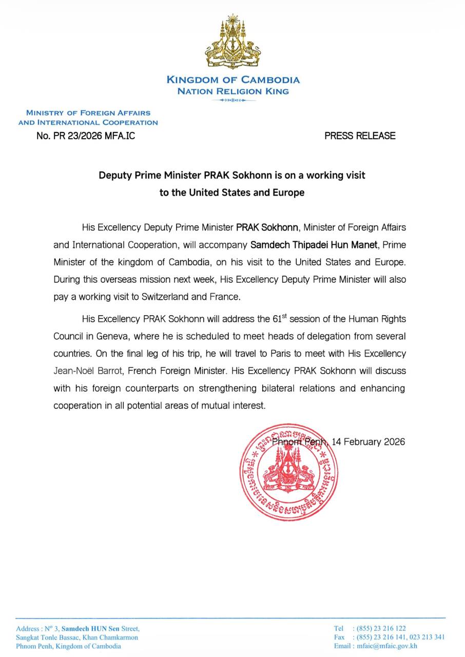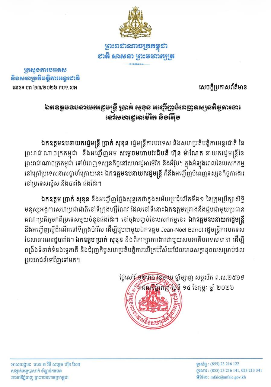ឯកឧត្តម ប្រាក់ សុខុន នឹងអញ្ជើញថ្លែងសុន្ទរកថាក្នុងសម័យប្រជុំលើកទី៦១ នៃក្រុមប្រឹក្សាសិទ្ធិ មនុស្សអង្គការសហប្រជាជាតិនៅទីក្រុងហ្សឺណែវ ដែលនៅទីនោះឯកឧត្តមគ្រោងនឹងជួបជាមួយប្រធាន គណៈប្រតិភូមកពីប្រទេសមួយចំនួនផងដែរ។ នៅចុងបញ្ចប់នៃបេសកកម្មនេះ ឯកឧត្តមឧបនាយករដ្ឋមន្ត្រី នឹងអញ្ជើញធ្វើដំណើរទៅទីក្រុងប៉ារីស ដើម្បីជួបជាមួយឯកឧត្តម Jean-Noel Barrot រដ្ឋមន្ត្រីការបរទេស នៃសាធារណរដ្ឋបារាំង។ ឯកឧត្តម ប្រាក់ សុខុន នឹងពិភាក្សាការងារជាមួយសមភាគីបរទេសនានា ដើម្បី ពង្រឹងទំនាក់ទំនងទ្វេភាគី និងជំរុញកិច្ចសហប្រតិបត្តិការលើគ្រប់វិស័យដែលមានសក្តានុពលសម្រាប់ផល ប្រយោជន៍ទៅវិញទៅមក៕