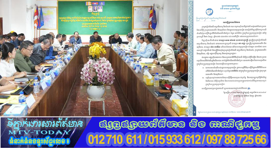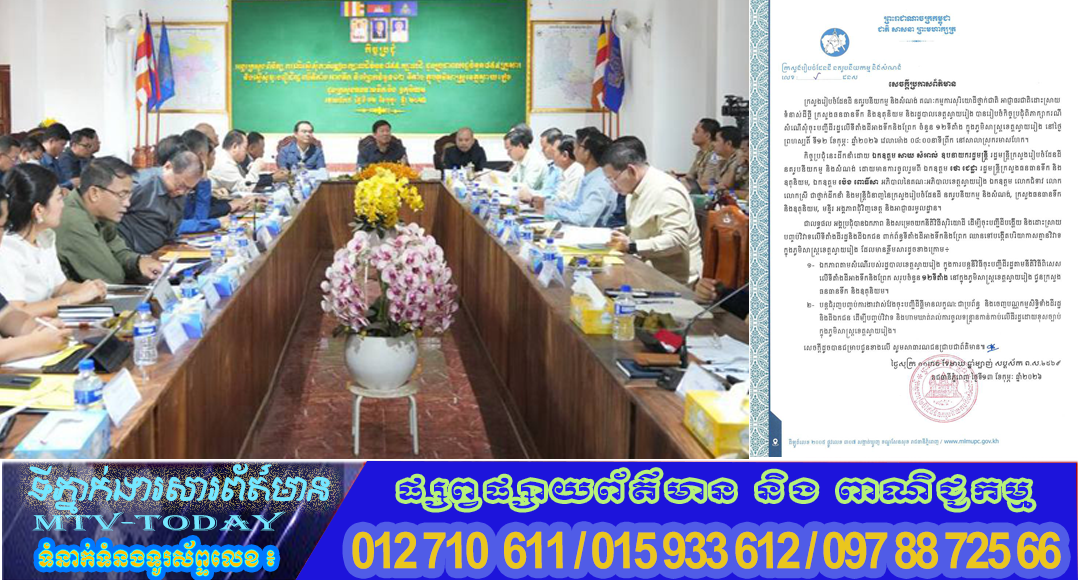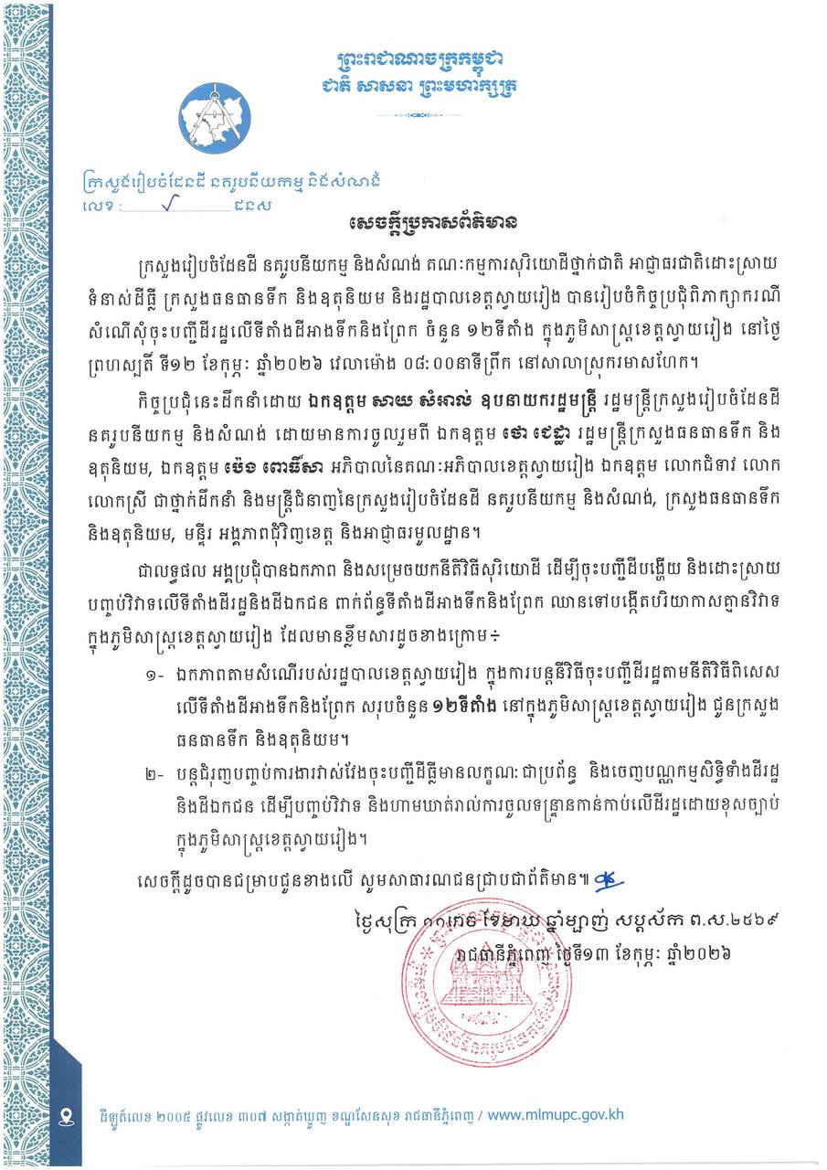 ក្រសួងរៀបចំដែនដី នគរូបនីយកម្ម និងសំណង់ ក្រសួងធនធានទឹក និងឧតុនិយម និងរដ្ឋបាលខេត្តស្វាយរៀង បានឯកភាព និងសម្រេចយកនីតិវិធីសុរិយោដី ដើម្បីចុះបញ្ជីដីបង្ហើយ និងដោះស្រាយបញ្ចប់វិវាទលើទីតាំងដីរដ្ឋនិងដីឯកជន ពាក់ព័ន្ធទីតាំងដីអាងទឹកនិងព្រែក ឈានទៅបង្កើតបរិយាកាសគ្មានវិវាទ ក្នុងភូមិសាស្ត្រខេត្តស្វាយរៀង៕