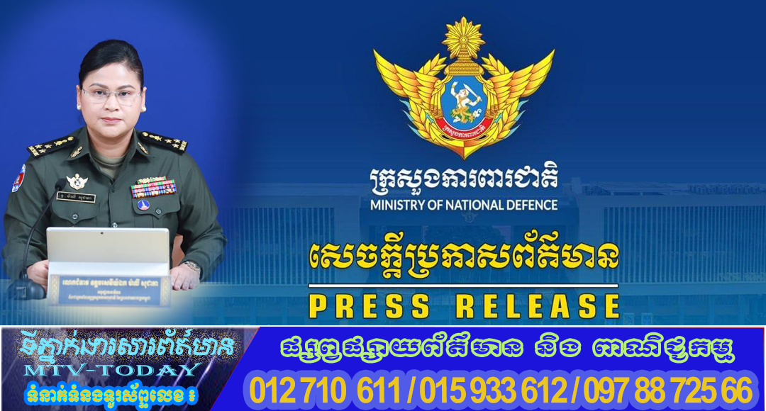 ភ្នំពេញ ៖ លោកជំទាវ ឧត្តមសេនីយ៍ឯក ម៉ាលី សុជាតា អ្នកនាំពាក្យក្រសួងការពារជាតិ នៃព្រះរាជាណាចក្រកម្ពុជា សូមជម្រាបជូនសាធារណជន អ្នកសារព័ត៌មានជាតិ និងអន្តរជាតិមេត្តាជ្រាបថា៖
