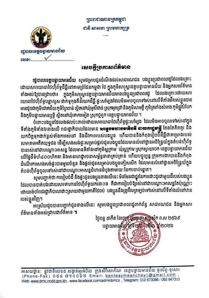 ខេត្តបន្ទាយមានជ័យ ៖ រដ្ឋបាលខេត្តបន្ទាយមានជ័យ បញ្ជាក់ថា ការរៀបចំដី និងផ្ទះជូនបងប្អូនភៀសសឹក នៅស្រុកស្វាយចេក មិនមែនជាថ្នូរនៃការដោះដូរជាមួយដីរបស់បងប្អូន ដែលបានបាត់បង់ដោយសារទាហានថៃហ៊ុព័ទ្ធយកនោះទេ គឺជាការរៀបចំឱ្យរស់នៅជាបណ្តោះអាសន្នតែប៉ុណ្ណោះ ដោយរង់ចាំរាជរដ្ឋាភិបាលដោះស្រាយជាមួយភាគីថៃចប់ បងប្អូននឹងត្រូវវិលត្រឡប់ទៅរស់នៅលើទីតាំងលំនៅឋានរបស់ខ្លួនវិញហើយ៕