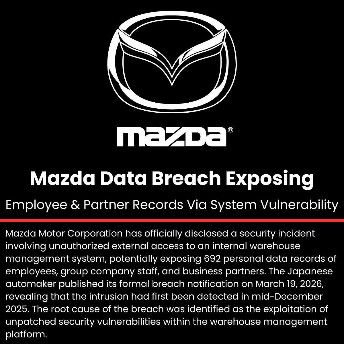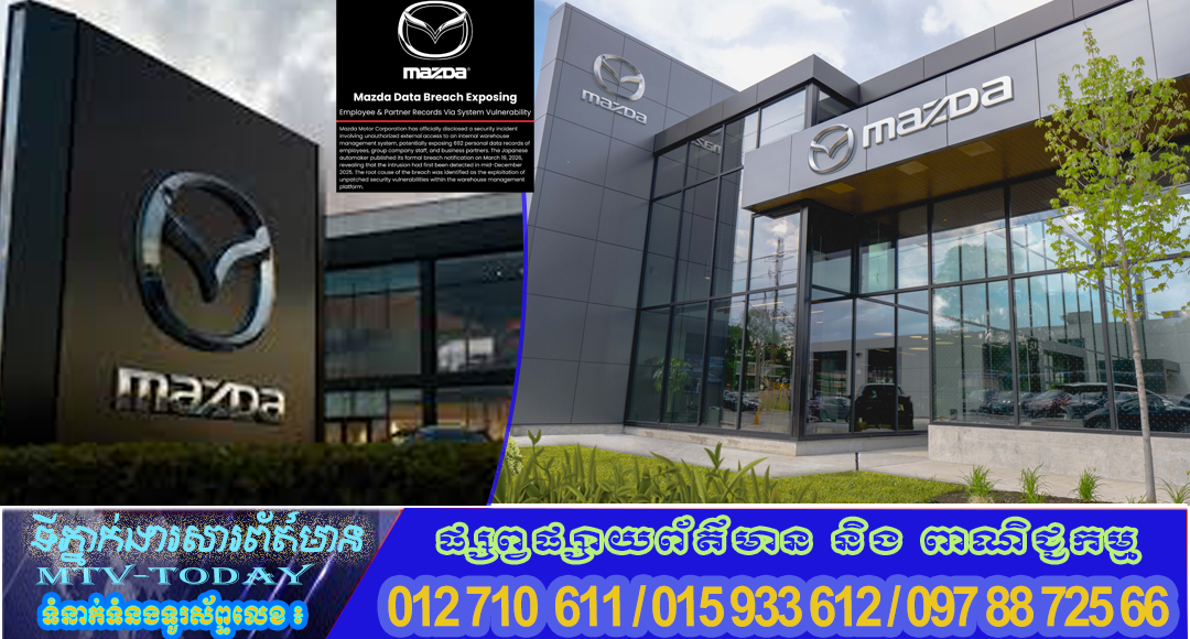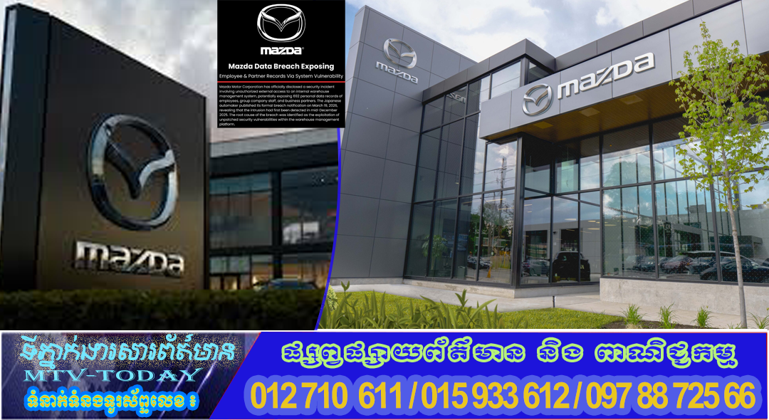 សាជីវកម្ម Mazda Motor Corporation បានប្រកាសជាផ្លូវការអំពីឧប្បត្តិហេតុសន្តិសុខសាយប័រមួយ ដែលពាក់ព័ន្ធនឹងការលួចចូលពីខាងក្រៅ(warehouse management system) ដែលអាចធ្វើឱ្យលេចធ្លាយទិន្នន័យ