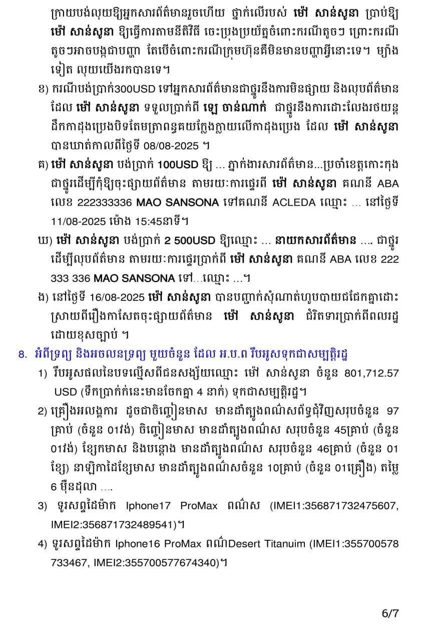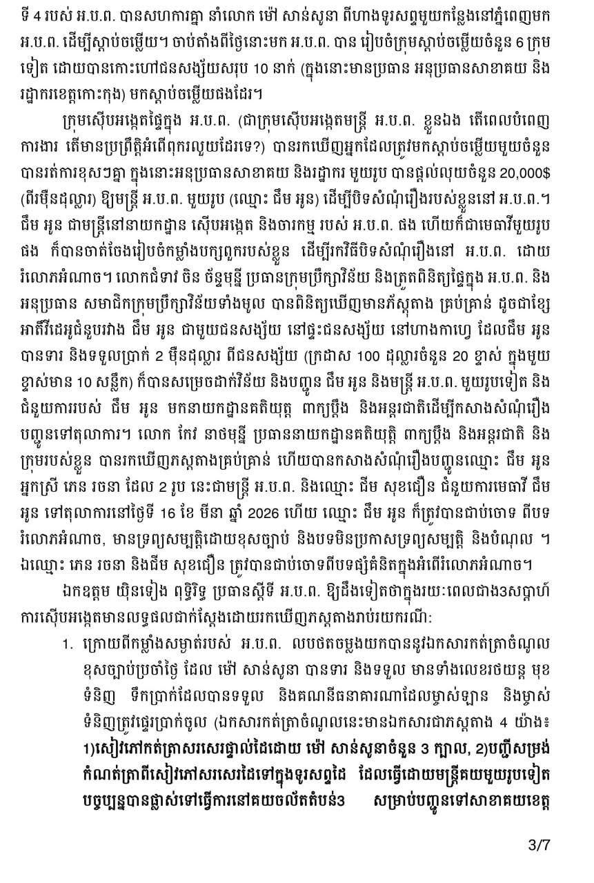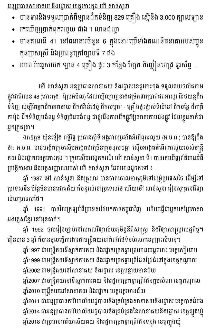 ចំពោះប្រតិបត្តិការស្រាវជ្រាវ និងបង្ក្រាបបទល្មើសពុករលួយនេះ ប្រធានស្តីទី ACU បណ្ឌិត យ៉ិនទៀង ពុទ្ធិរិទ្ធ ដឹកនាំការងារសំយោគករណីលោក ម៉ៅ សានសូនា ចំណែកឯឧបការី ACU លោក យ៉ិនទៀង ពុទ្ធិរ៉ា ជាអ្នកដឹកនាំផ្ទាល់ជាមួយក្រុមការងារស៊ើបអង្កេតជាង ១០ក្រុម លើករណីលោក ម៉ៅ សាន់សូនា និងស្តាប់ចម្លើយជនសង្ស័យ៕ by FN