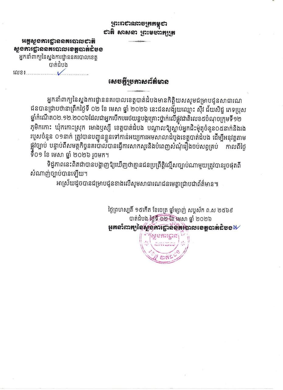 ខេត្តបាត់ដំបង ៖ នាព្រឹកថ្ងៃទី០២ ខែ មេសា ឆ្នាំ២០២៦នេះ សមត្ថកិច្ចនគរបាលបានបញ្ជូនជនសង័្សយឈ្មោះ ស៊ីវ ជ័យសិទ្ធ ភេទប្រុស ទៅកាន់អយ្យការអមសាលាដំបូងខេត្តបាត់ដំបង ដេីម្បីអនុវត្តទោសតាមផ្លូវច្បាប់៕
