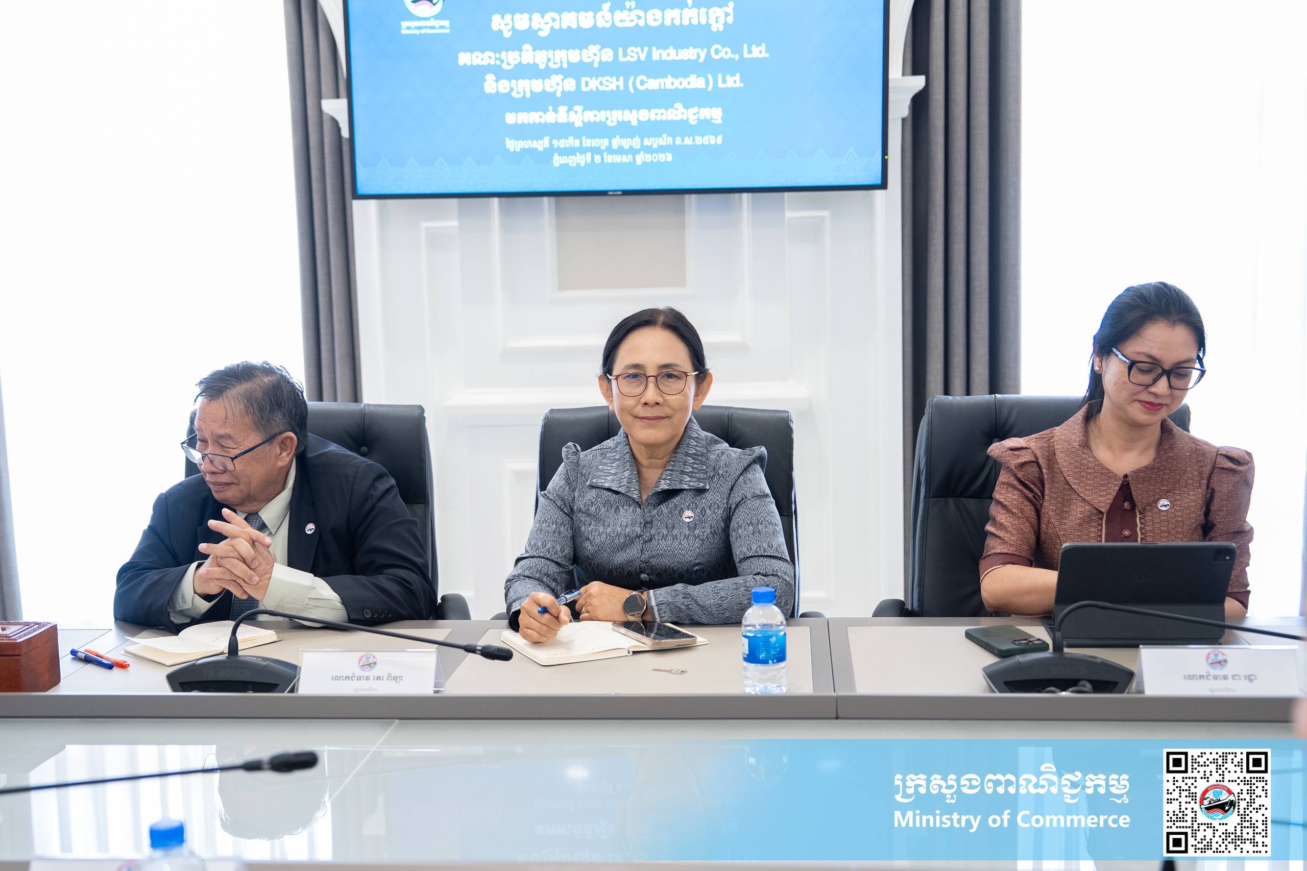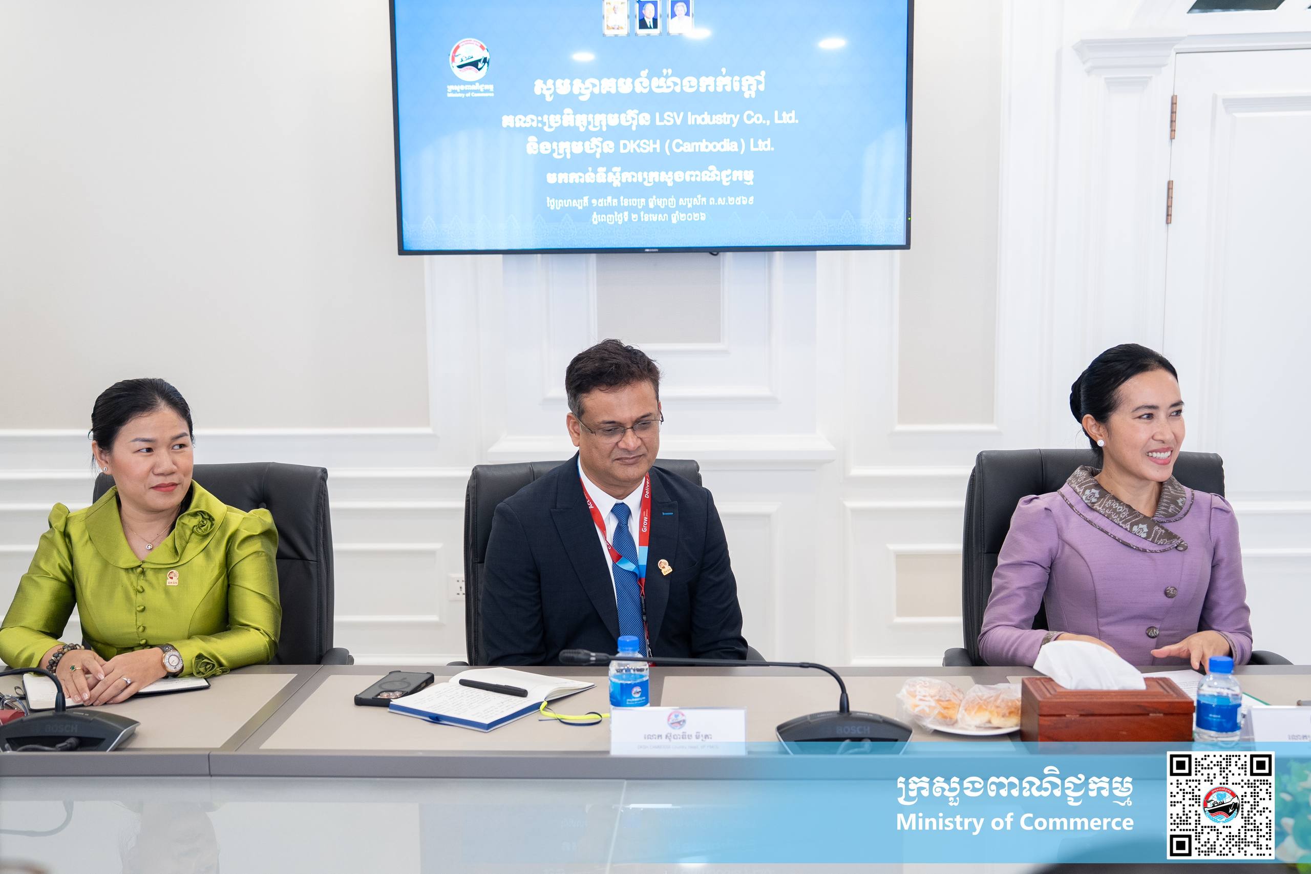 ភ្នំពេញ ៖ នារសៀលថ្ងៃព្រហស្បត្តិ៍ ទី២ ខែមេសា ឆ្នាំ២០២៦ នៅទីស្ដីការក្រសួងពាណិជ្ជកម្ម លោកជំទាវ ចម និម្មល រដ្ឋមន្រ្តីក្រសួងពាណិជ្ជកម្ម បានអនុញ្ញាតជូនគណៈប្រតិភូក្រុមហ៊ុន LSV និង DKSH ដែលដឹកនាំដោយ លោកស្រី នុត សម្ជស្ស និងលោក ស៊ូបាឌីប មីត្រា ចូលជួបសម្តែងការគួរសម និងពិភាក្សាការងារ។