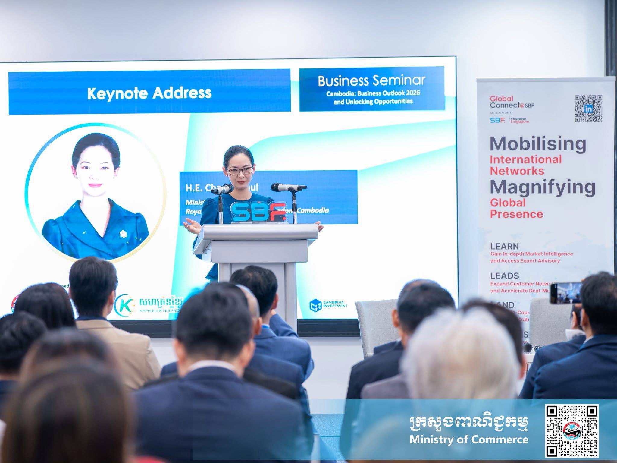 លោកជំទាវរដ្ឋមន្ត្រី បានលើកឡើងបែបនេះ នាឱកាសដែល លោកជំទាវ ដឹកនាំគណៈប្រតិភូកម្ពុជា ចូលរួមសិក្ខាសាលាធុរកិច្ចស្តីពី “កម្ពុជា៖ ទស្សនវិស័យធុរកិច្ចឆ្នាំ២០២៦ និងឱកាសធុរកិច្ច–Cambodia: Business Outlook 2026 and Unlocking Opportunities” ដែលរៀបចំឡើងដោយ សហព័ន្ធធុរកិច្ចសិង្ហបុរី (Singapore Business Federation) ក្រោមកិច្ចសហការជាមួយក្រុមហ៊ុន Aquarii BD Cambodia និងមានការចូលរួមពីធុរជនកម្ពុជា តំណាងវិស័យឯកជនសិង្ហបុរី និងសមាជិកសហព័ន្ធធុរកិច្ចសិង្ហបុរី វិនិយោគិន ធុរជន ព្រមទាំងដៃគូពាណិជ្ជកម្មជាច្រើនរូប ដើម្បីស្វែងយល់អំពីសក្តានុពលសេដ្ឋកិច្ចកម្ពុជា និងពិភាក្សាអំពីឱកាសសហប្រតិបត្តិការ ក្នុងវិស័យអាទិភាព រួមមាន៖ ភស្តុភារកម្ម និងការគ្រប់គ្រងខ្សែច្រវាក់ផ្គត់ផ្គង់, កសិ-ឧស្សាហកម្ម និងការកែច្នៃម្ហូបអាហារ, សេដ្ឋកិច្ចឌីជីថល, និងឧស្សាហកម្មតម្លៃបន្ថែមខ្ពស់ ជាដើម។