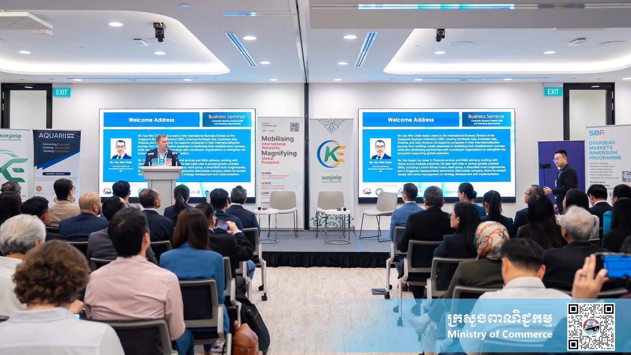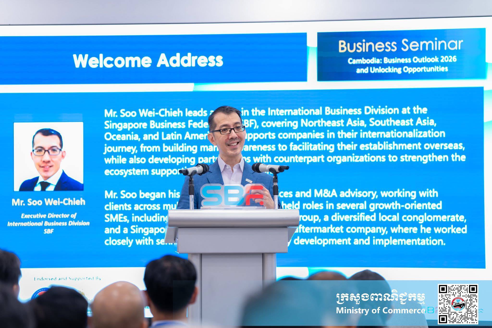 ប្រទេសសិង្ហបុរី ៖ នាព្រឹកថ្ងៃព្រហ្បតិ៍ ទី៩ ខែមេសា ឆ្នាំ២០២៦ នៅមជ្ឈមណ្ឌលសហព័ន្ធធុរកិច្ចសិង្ហបុរី ប្រទេសសិង្ហបុរី លោកជំទាវ ចម និម្មល រដ្ឋមន្ត្រីក្រសួងពាណិជ្ជកម្ម បានថ្លែងថា៖ “កម្ពុជា ជាទិសដៅយុទ្ធសាស្ត្រសម្រាប់ធុរកិច្ចសិង្ហបុរី ក្នុងការពង្រីកទីផ្សារពាណិជ្ជកម្មក្នុងតំបន់ តាមរយៈការបន្តអនុវត្តគោលនយោបាយបើកចំហពាណិជ្ជកម្ម ទាក់ទាញវិនិយោគ កិច្ចសម្រួលពាណិជ្ជកម្ម ជំរុញការនាំចេញ និងការធ្វើទំនើបកម្មបរិយាកាសធុរកិច្ច”។
