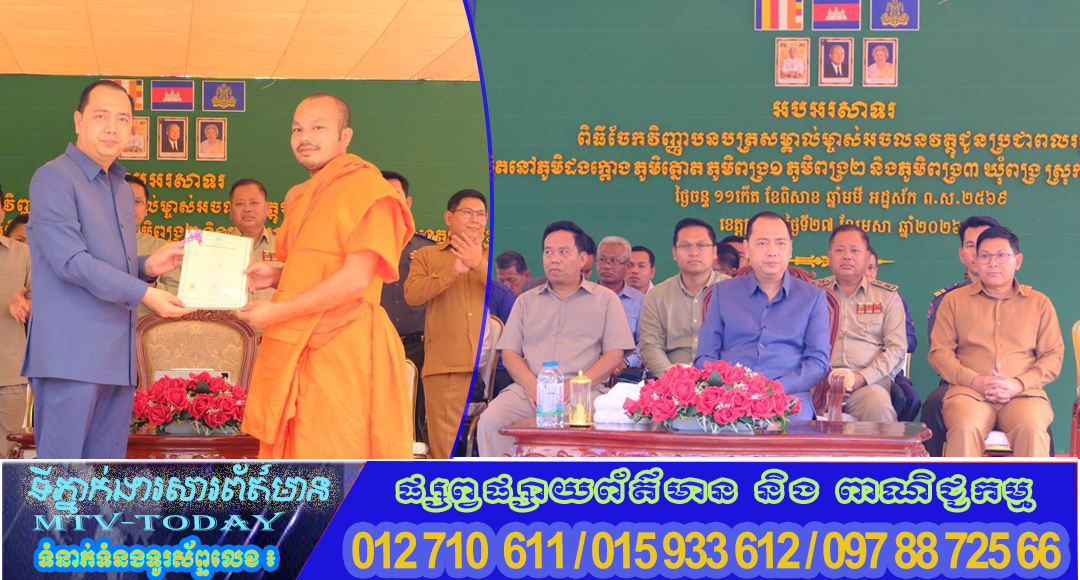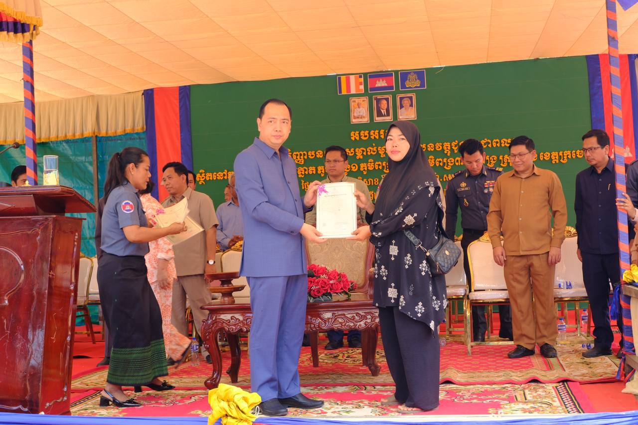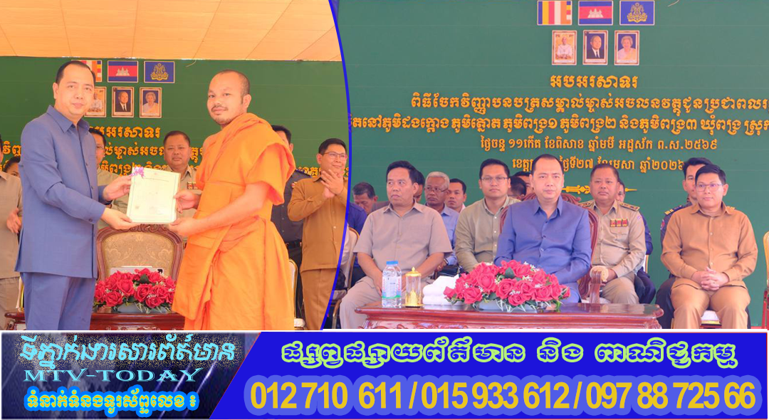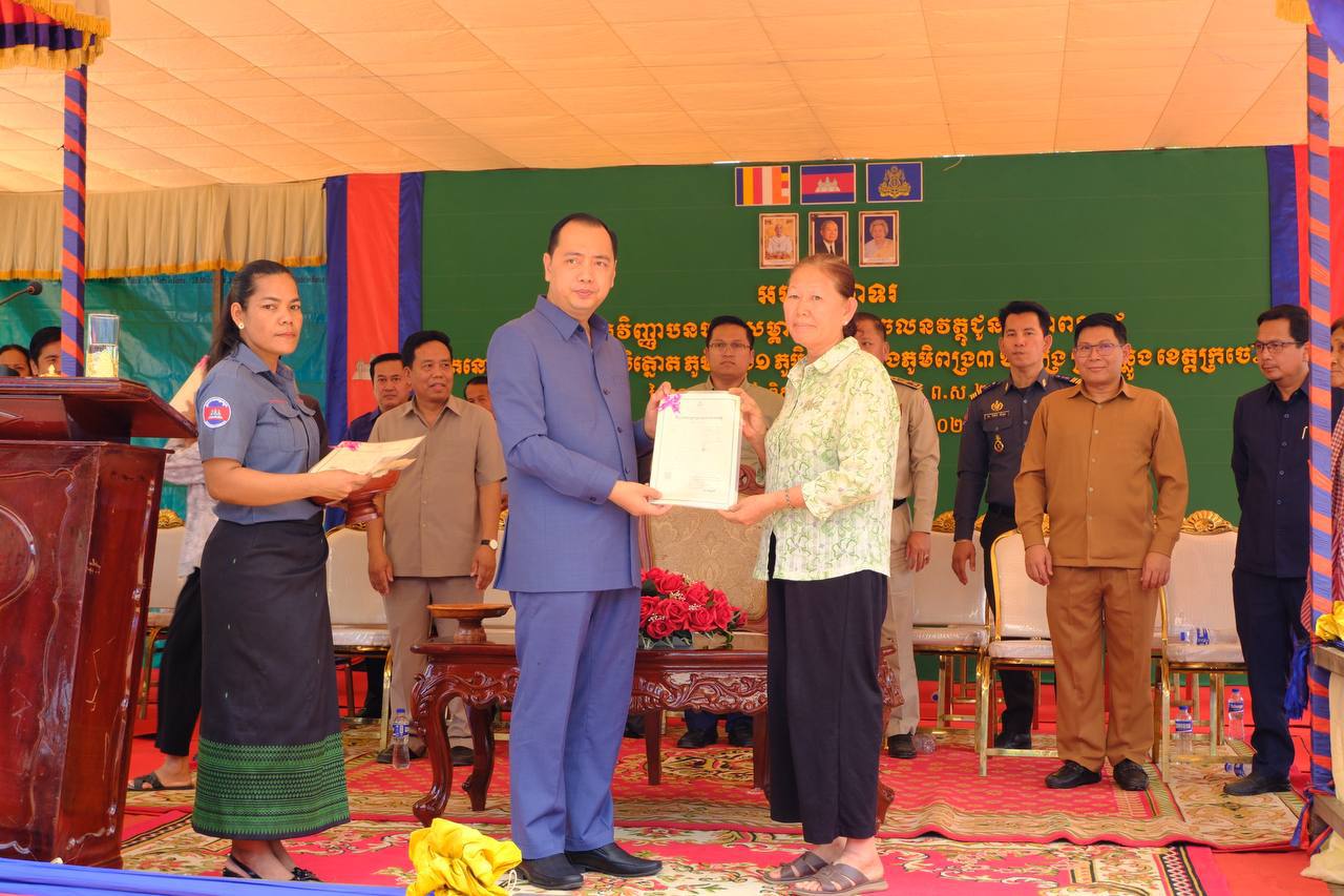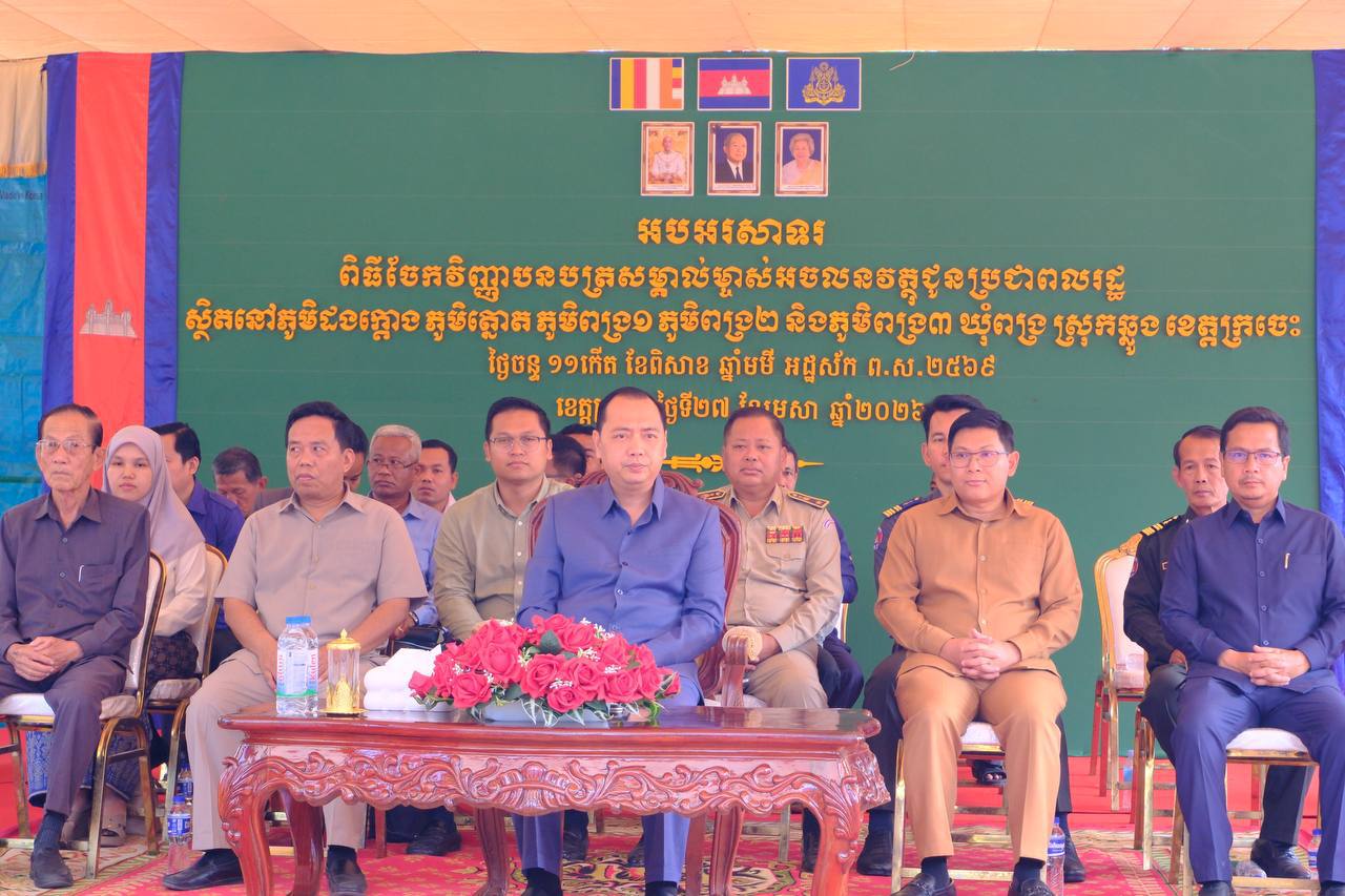 នាថ្ងៃទី២៧ ខែមេសា ឆ្នាំ២០២៦ ក្រុមការងារមន្ទីររៀបចំដែនដី នគរូបនីយកម្ម សំណង់ និងសុរិយោដីខេត្តក្រចេះ បានចូលរួមប្រគល់វិញ្ញាបនបត្រសម្គាល់ម្ចាស់អចលនវត្ថុ ជូនប្រជាពលរដ្ឋជាម្ចាស់ក្បាលដីចំនួន ៥ភូមិ គឺភូមិពង្រ១ ភូមិពង្រ២ ភូមិពង្រ៣ ភូមិដងក្តោង និងភូមិត្នោត ឃុំពង្រ ស្រុកឆ្លូង ខេត្តក្រចេះ សរុបចំនួន ៣ ៨២០ក្បាលដី ក្រោមអធិបតីភាពឯកឧត្តម នេត្រ ភត្ត្រា រដ្ឋមន្ត្រីក្រសួងព័ត៌មាន និងជាប្រធានក្រុមការងាររាជរដ្ឋាភិបាលចុះមូលខេត្តក្រចេះ៕
